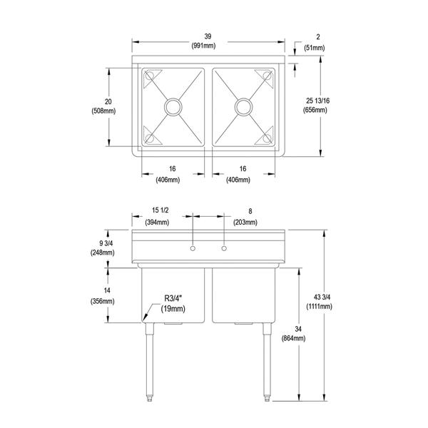 Elkay Dependabilt Stainless Steel 39" x 25-13/16" x 43-3/4" 16 Gauge Two Compartment Sink with Stainless Steel Legs