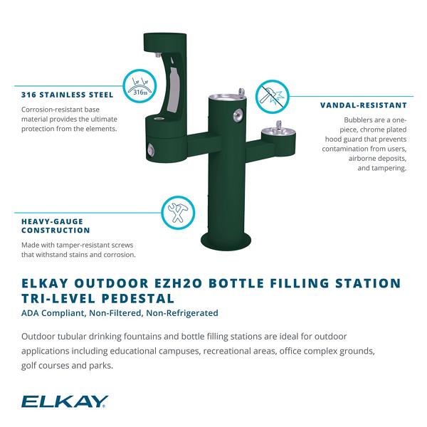 Outdoor Bottle Filling Stations ideal for educational campuses and recreational areas. Powder-coated exterior over a corrosion-resistant stainless steel type-316 base material to provide protection from the elements.