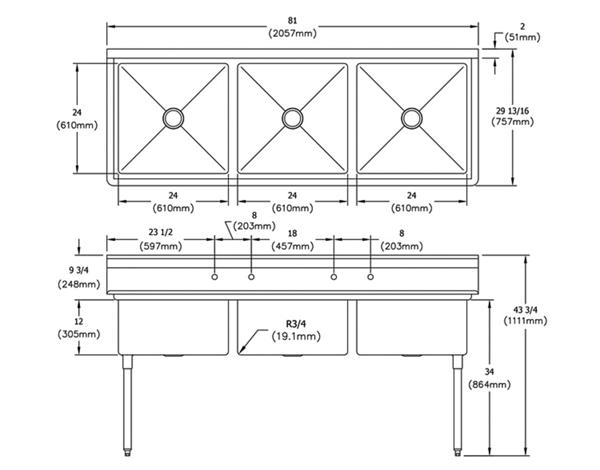Elkay Dependabilt Stainless Steel 81" x 29-13/16" x 43-3/4" 18 Gauge Three Compartment Sink with Stainless Steel Legs