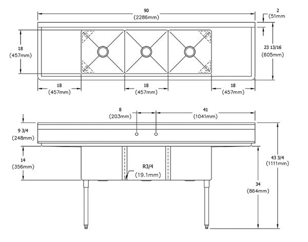 Elkay Dependabilt Stainless Steel 90" x 23-13/16" x 43-3/4" 18 Gauge Three Compartment Sink w/ 18" Left and Right Drainboards and Stainless Steel Legs
